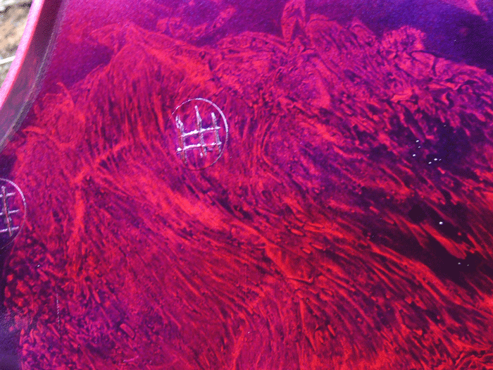 サランラップを使って独特の模様を付け、その上にキャンディカラー(半透明の塗料)を乗せていく塗装です。